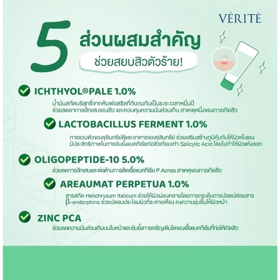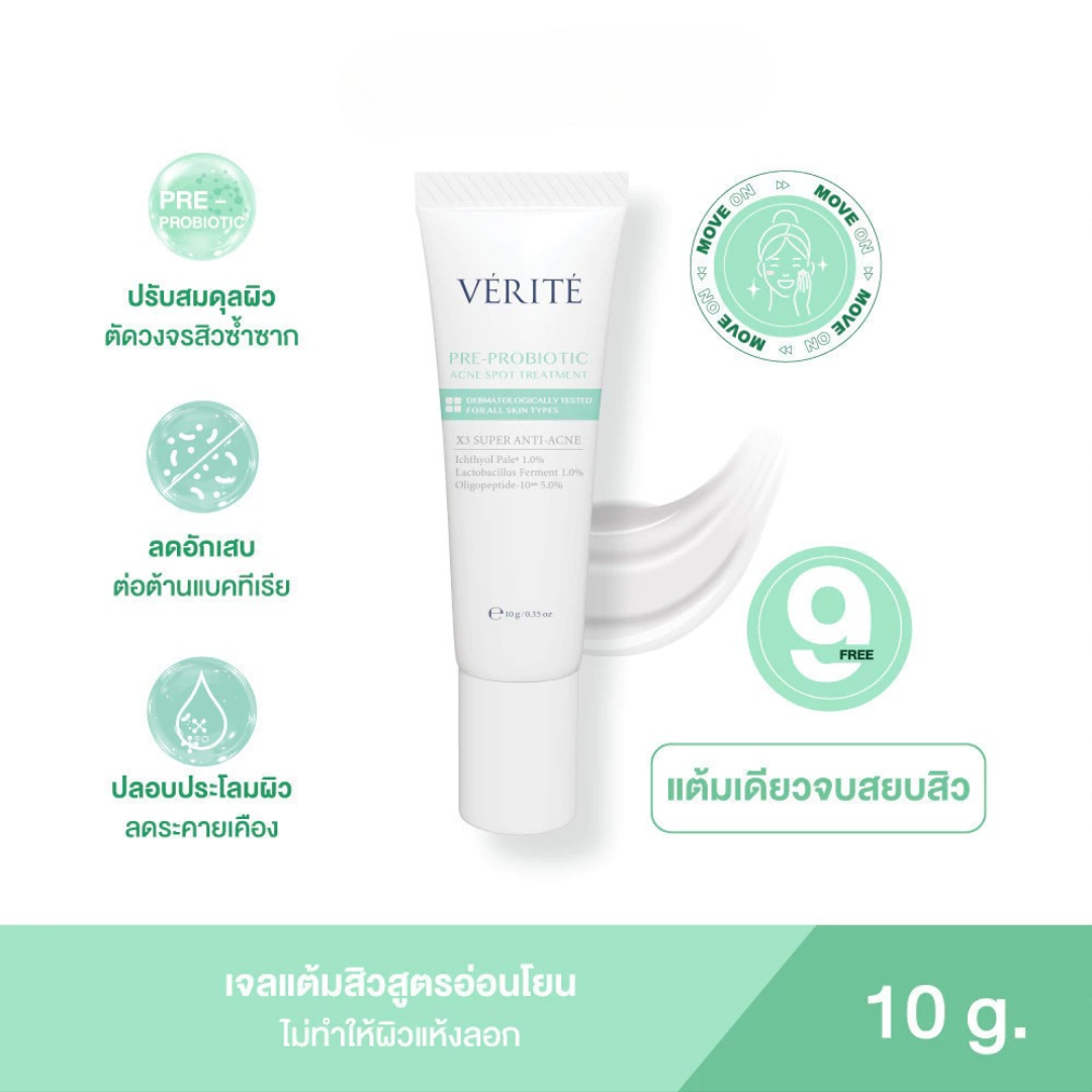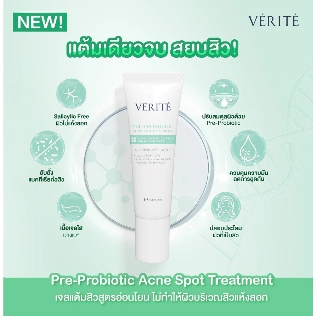The VERITÉ Pre-Probiotic Acne Spot Treatment 10g is a specialized anti-acne solution crafted to provide gentle yet effective care for acne-prone skin. Powered by a unique combination of pre-probiotics, peptides, and mineral-rich extracts, this spot gel helps reduce oiliness, calm irritation, and maintain skin balance. Its non-drying texture ensures skin stays comfortable, hydrated, and clear-looking with daily use.