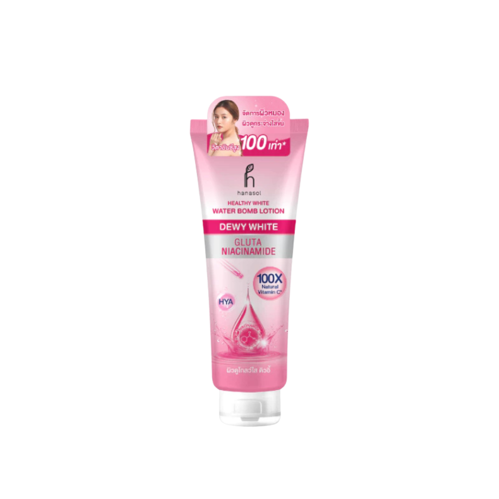 Indulge in intense hydration with Hanasol Healthy White Water Bomb Body Lotion, a lightweight, fast-absorbing water-based formula that delivers a dewy, radiant glow. Available in Dewy White (with Niacinamide for brightening and moisture) and Spotless White (with Gluta Retinol-D for targeted spot care), this lotion bombards skin with moisture while helping achieve a brighter, more even-looking complexion. Enriched with 100X Natural Vitamin C, Hyaluronic Acid (HYA), and potent actives, it leaves skin soft, supple, and luminous without greasiness. Perfect for daily use on all skin types, this 250ml tube provides long-lasting hydration and a fresh, healthy appearance. Made in Thailand with premium ingredients.