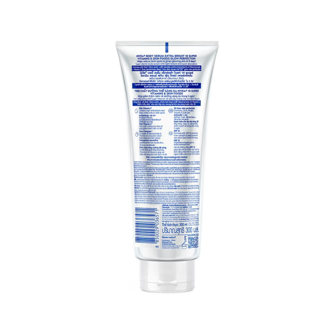 Unlock radiant, even-toned body skin with NIVEA Extra Bright 10 Super Vitamins Skin Foods Glow Perfection Body Serum SPF15 — a lightweight, fast-absorbing serum-lotion hybrid enriched with 100X concentrated super vitamin complex and potent skin food extracts. This multi-benefit formula visibly reduces stubborn dark spots, dullness, and uneven tone in just 7 days while providing daily broad-spectrum SPF15 protection to prevent further sun damage and pigmentation. Powered by Vitamins A, C, B3, Pro B5, B9, and E plus nourishing extracts from lemon, goji berry, pomegranate, and avocado, it repairs, brightens, smooths, and renews skin for a healthy, youthful glow.