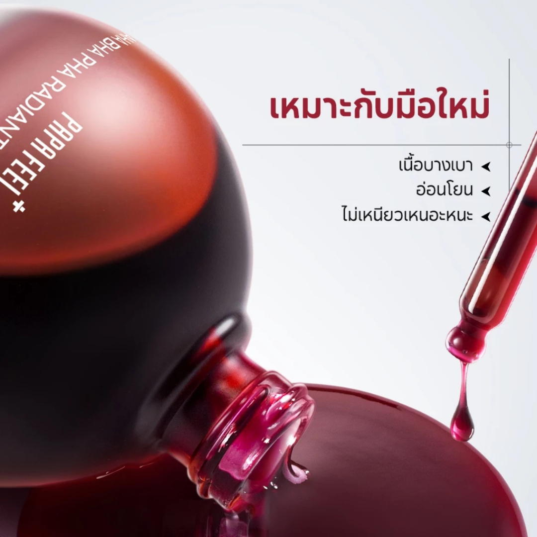 Experience gentle yet powerful skin renewal with PAPA FEEL+ AHA BHA PHA Radiant Peeling Solution, a multi-acid serum that transforms dull, congested skin in just 60 seconds of contact. This innovative no-rinse peeling treatment combines 8% AHA (Glycolic Acid) for surface exfoliation, 1% BHA (Salicylic Acid) for deep pore cleansing, and 0.5% PHA (Lactobionic Acid) for mild hydration and barrier-safe renewal — delivering visible brightness, refined texture, and reduced blackheads without harsh irritation. Enriched with Niacinamide + Vitamin C for spot correction and radiance, plus Centella Asiatica + Sodium Hyaluronate for soothing and deep moisture, it leaves skin smoother, clearer, and glowing. The lightweight, fast-absorbing red serum glides on effortlessly and rinses clean. Ideal for dull, rough, acne-prone, or uneven skin seeking professional-grade peeling at home. Made in Thailand with a balanced, skin-friendly acid complex for safe, effective weekly use.