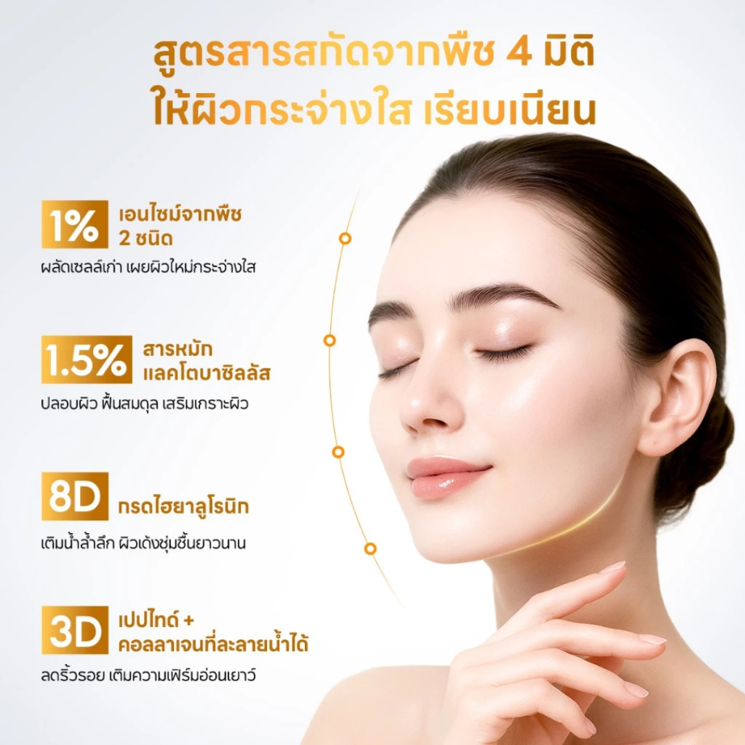 Reveal smoother, clearer, and more youthful skin with PAPA FEEL Enzyme Peptide Renewal Serum, a gentle, no-acid exfoliating treatment that renews skin without irritation. Powered by 1% dual plant enzymes (Papain from papaya + Bromelain from pineapple), this lightweight golden serum provides mild yet effective enzymatic exfoliation to remove dull surface cells, unclog pores, and fade early signs of aging. Infused with 1.5% fermented Lactobacillus, 8D Hyaluronic Acid complex, Ectoin, Ceramide NP, 5 advanced anti-aging actives (including Bakuchiol, soluble collagen, and multi-peptides), it calms, deeply hydrates, strengthens the skin barrier, and promotes firmness — perfect for sensitive, acne-prone, rough, or dull skin. The fast-absorbing, non-sticky oil-like texture delivers visible brightness, refined texture, and reduced congestion without redness or dryness. Made in Thailand with clean, high-efficacy ingredients for safe daily renewal and glowing skin.