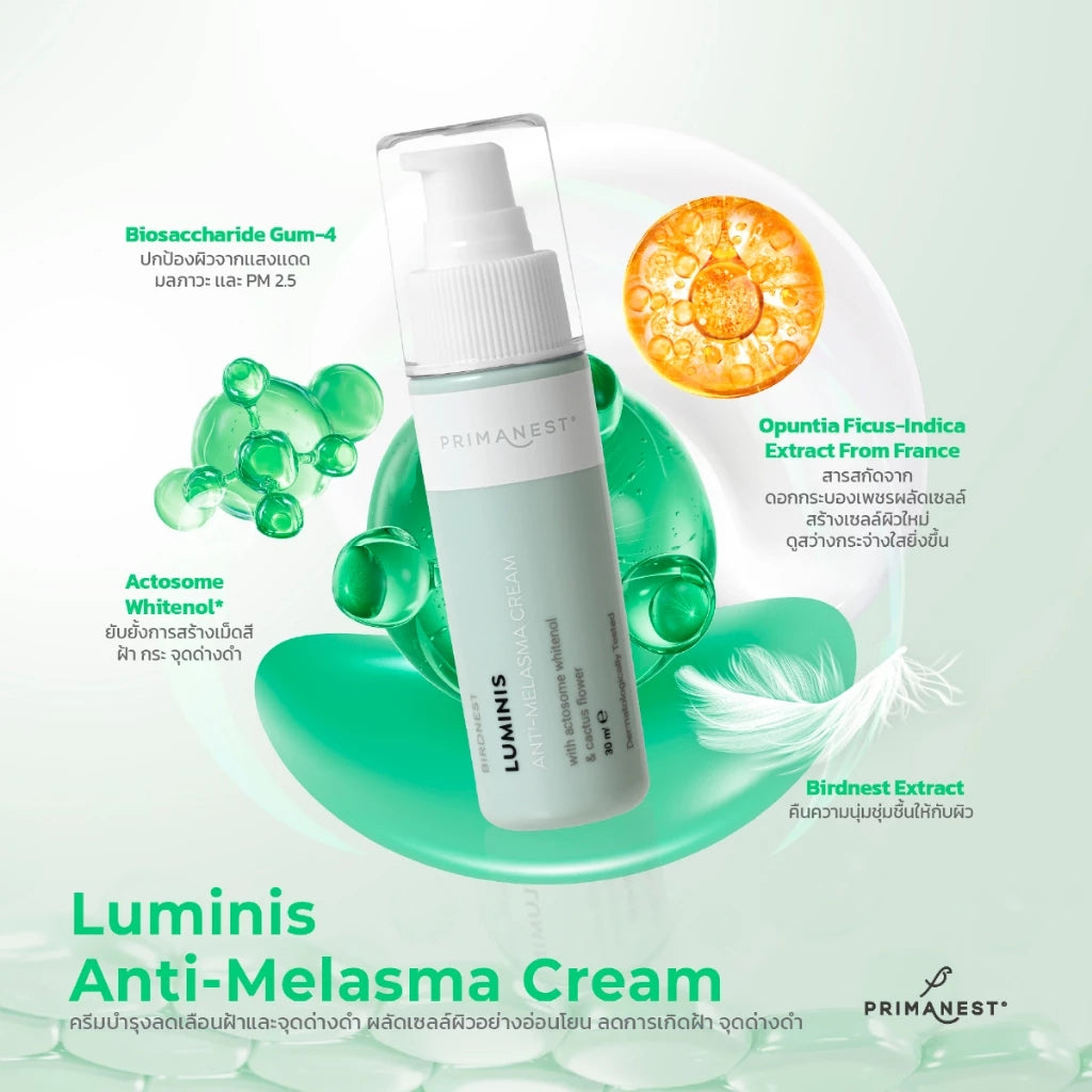Brighten your complexion with Primanest Birdnest Luminis Anti-Melasma Cream, a luxurious daily moisturizer that helps visibly reduce dark spots, freckles, and uneven tone. Formulated with Actosome Whitenol, Opuntia Ficus-Indica Extract, and pure bird's nest extract, this advanced cream gently renews the skin, replenishes hydration, and leaves the face looking smooth, radiant, and luminous.