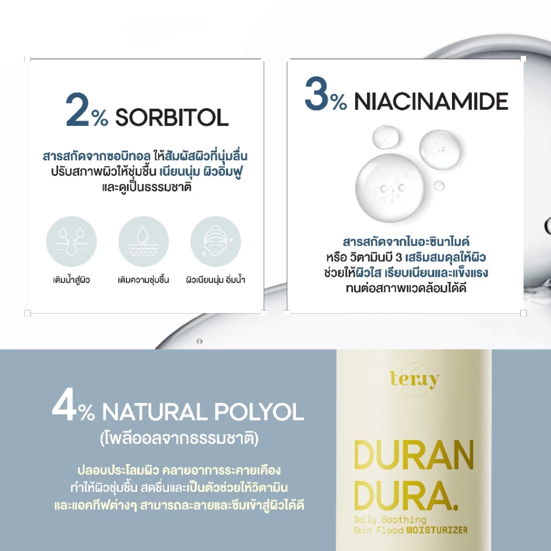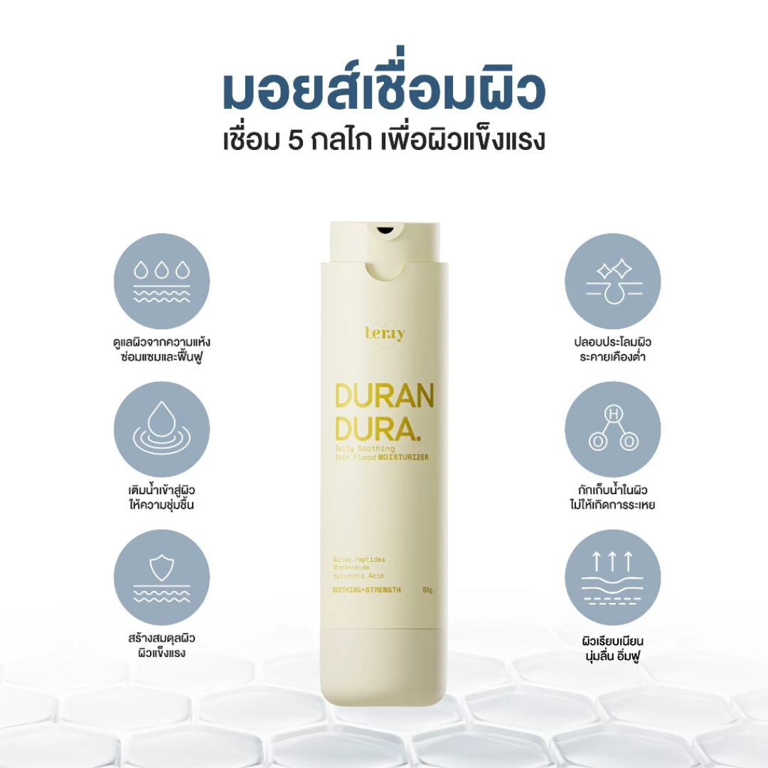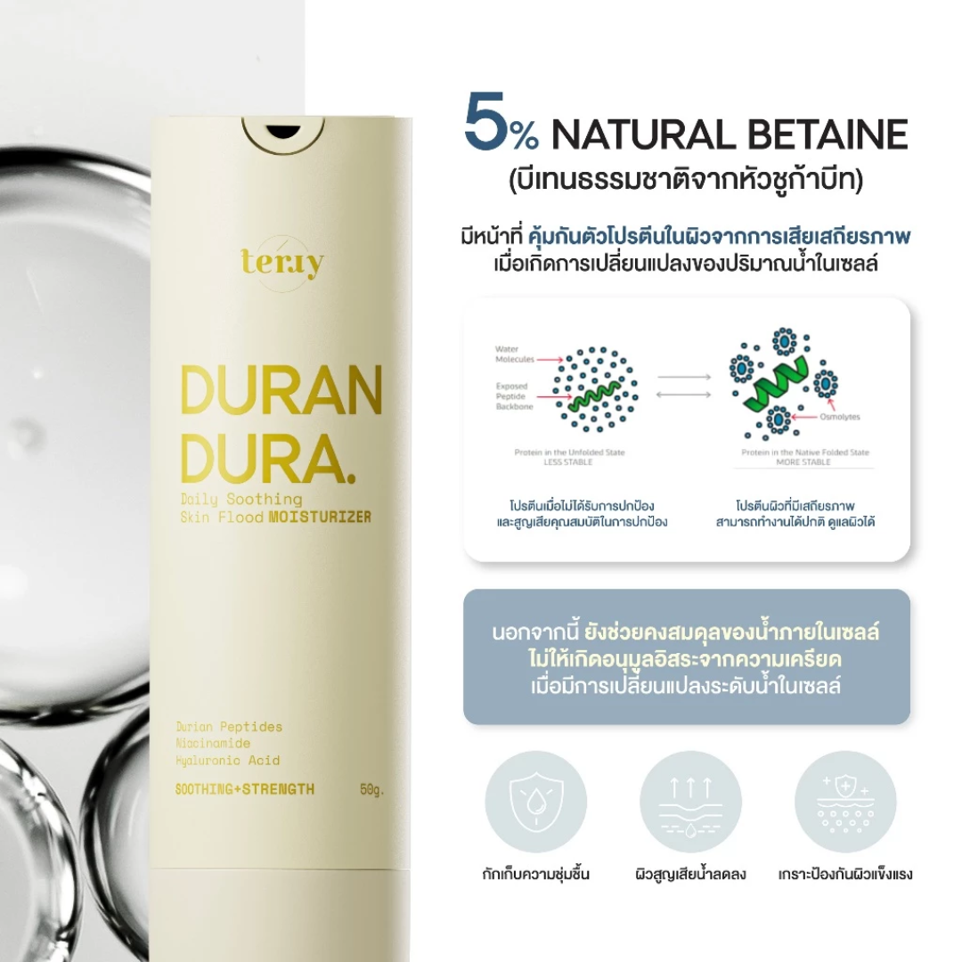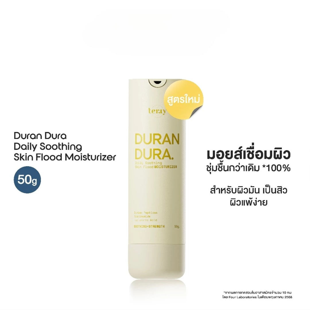 Give your skin a daily dose of strength and hydration with Terry Duran Dura Daily Soothing Skin Flood Moisturizer. This all-in-one moisturizer features five key actives — Betaine, Bio-Ectoin, Niacinamide, Sorbitol, and Natural Polyol — to build a healthy, resilient skin barrier. With a smooth semi-gel texture, it delivers intense moisture without heaviness. The unique Durian Peptide Complex and Marine Source Water from France help boost hydration while restoring smoothness to dull or tired skin. Perfect for sensitive, oily, or acne-prone complexions, it instantly relieves dryness and inflammation while leaving skin soft, hydrated, and naturally radiant.