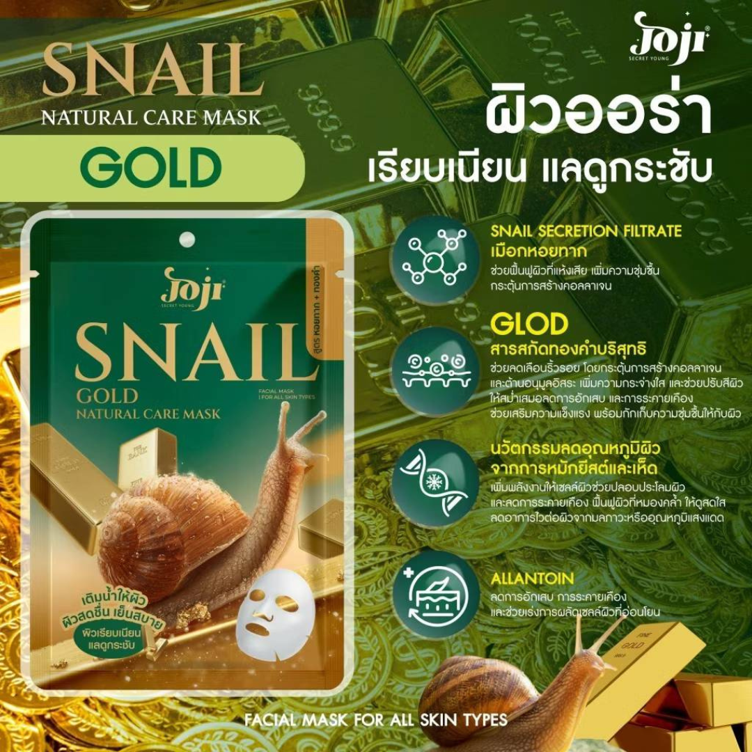 Pamper your skin with luxurious regeneration using Joji Secret Young Snail Gold Natural Care Mask— a premium hydrogel sheet mask enriched with pure snail secretion filtrate and real gold essence. This deeply nourishing facial treatment intensely hydrates, repairs, and revitalizes dull, tired, or aging skin, delivering instant plumpness, smoothness, and a radiant glow. Snail mucin works to boost collagen, heal micro-damage, and improve elasticity, while colloidal gold provides powerful antioxidant protection and brightening. Allantoin soothes irritation and supports barrier recovery. The ultra-adherent, essence-soaked sheet melts into skin for maximum absorption — leaving it dewy, youthful, and visibly healthier after just one use. Ideal for all skin types, especially dry, dehydrated, sensitive, or lackluster complexions, craving spa-level care at home. Made in Thailand with high-potency natural actives for glowing, bouncy, and repaired skin.